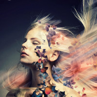 blonde hair and is wearing what appears to be a black top. Surrounding her head are various elements, including petals that might suggest a flower or floral theme. There are also other patterns and shapes that could indicate an abstract representation of nature or