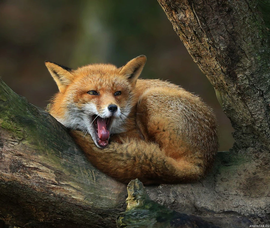a red fox sitting on a tree branch. The fox appears to be relaxed, with its mouth open as if it is yawning or panting. It has a dense fur and its coloration is typical of the species, which consists of a reddish-
