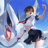 a large dragon-like creature near her, possibly indicating a battle or confrontation between the two characters. The setting looks like it could be on an island or at the edge of