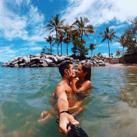 palm trees in the background. One of them is taking a selfie, while another person takes a picture from the shore, capturing this