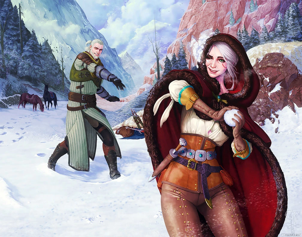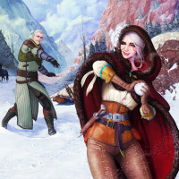 a snowy landscape, which includes mountains and a forest in the background. The characters seem to be interacting with each other in a scene that is likely part of the game's narrative.