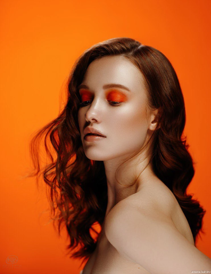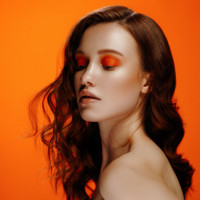 brown hair and her makeup includes defined eyebrows, eyeshadow, and lipstick in shades of orange and red. The background is solid orange, which contrasts with her skin tone and enhances the vibrancy of the image.