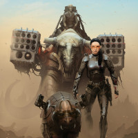 a desert environment, and there's a sense of motion or action suggested by the dust being kicked up in the background. The overall atmosphere suggests a theme of exploration or combat within a futuristic or