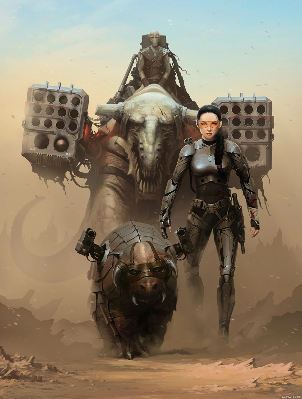 armor pieces and what seem to be weaponry on its back. In front of these characters is another