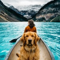 a body of water that resembles a fjord or glacial lake due to its deep blue color and the surrounding mountainous terrain. Both the girl and the dog appear calm and are facing away from the viewer, looking at the scenery ahead. The environment suggests they might be in a region known for its picturesque landscapes, such as Banff