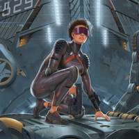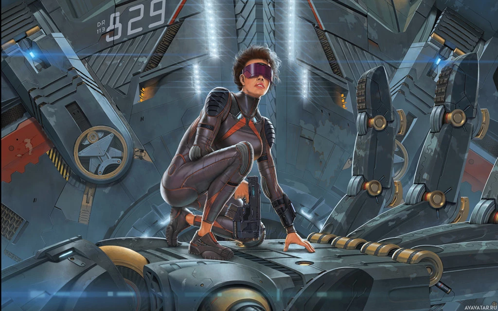 Картинка показывает женского персонажа в научно-фантастической обстановке. Она носит футуристические доспехи или костюмы, которые обычно ассоциируются с такими жанрами. Окружающая среда включает в себя различные передовые технологии и оборудование, которые предполагают высокотехнологичный мир или космический корабль. Есть ощущение приключений и исследований, переданных изображением.