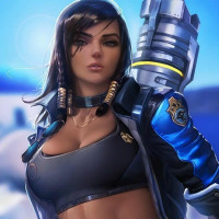 a female character from the video game "Overwatch." She is wearing a black and blue outfit that appears to be a part of her in-