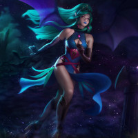 a nighttime scene in a forest or a similar environment, which adds to the fantasy atmosphere of the character.