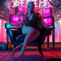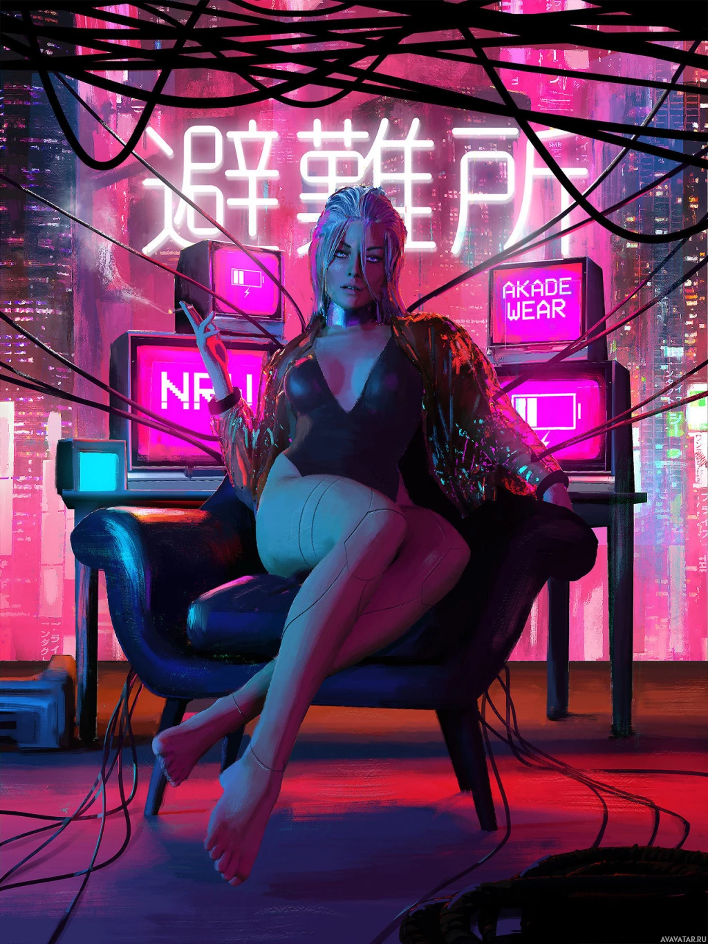 neon lights, suggesting a high-tech setting. There are also Chinese