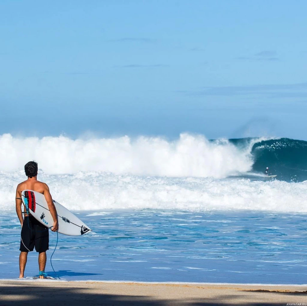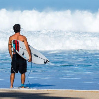 the shore of a beach, holding a surfboard. They are facing the ocean where