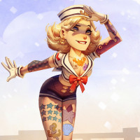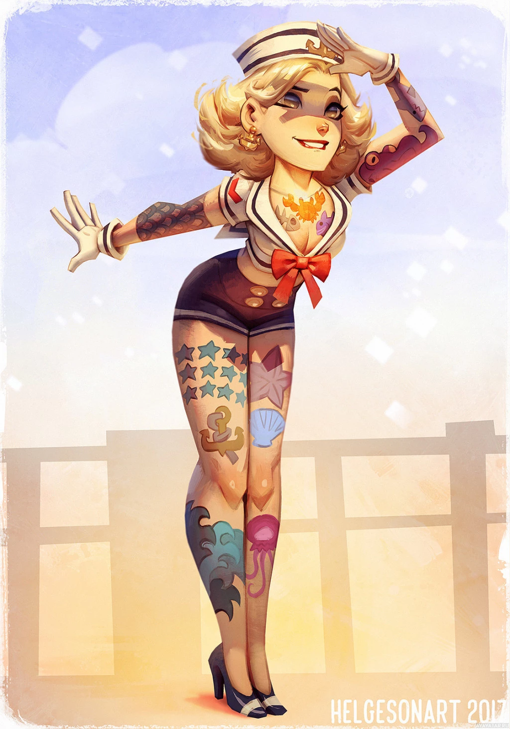 a sailor hat with a badge, a tie, and a pair of shoes. Her body is adorned with tattoos on her arms. Additionally, she has piercings in both ears. The character is standing confidently with one hand on her hip, posing for the viewer. The background suggests
