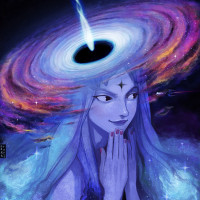 a black hole from which light seems to be emanating, giving the impression that the girl is somehow connected or interacting with this celestial phenomenon.
