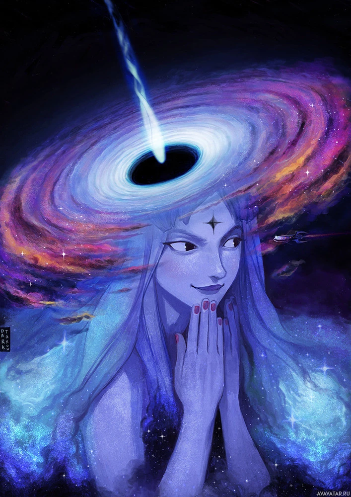 long hair, wearing a blue outfit that appears to be floating or being held by the cosmos. She has