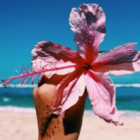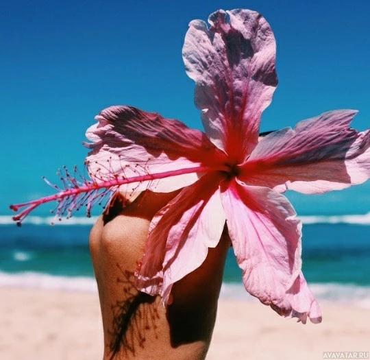 На картине изображена рука человека, держащая красный и розовый цветок, который кажется гибискусом, на фоне ясного голубого неба. Это можно сделать на пляже или на побережье, учитывая наличие песка и океана на заднем плане.