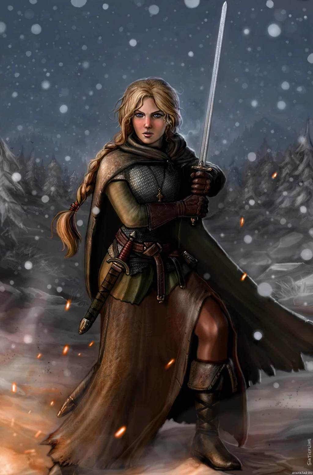 a female character with blonde hair, holding a sword in one hand and a shield in the other. She is dressed in what appears to be a fantasy-style outfit reminiscent of a warrior or adventurer, complete with a cloak that adds to her battle-ready appearance. The setting seems to be
