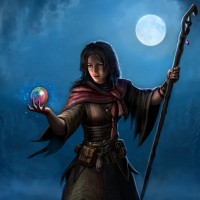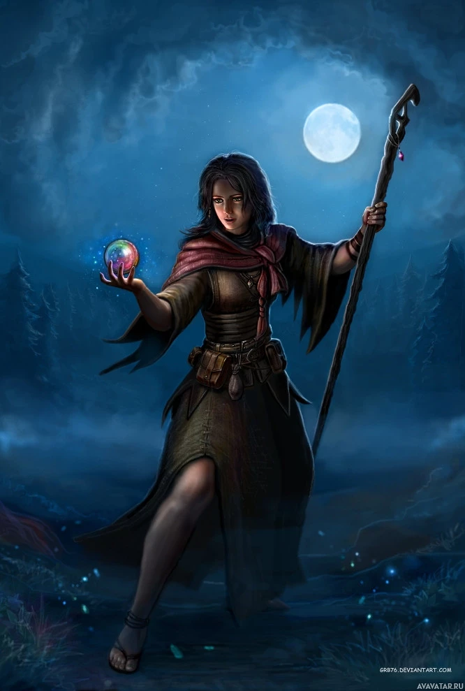 a fantasy character, specifically what appears to be a witch or sorcerer. She has