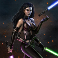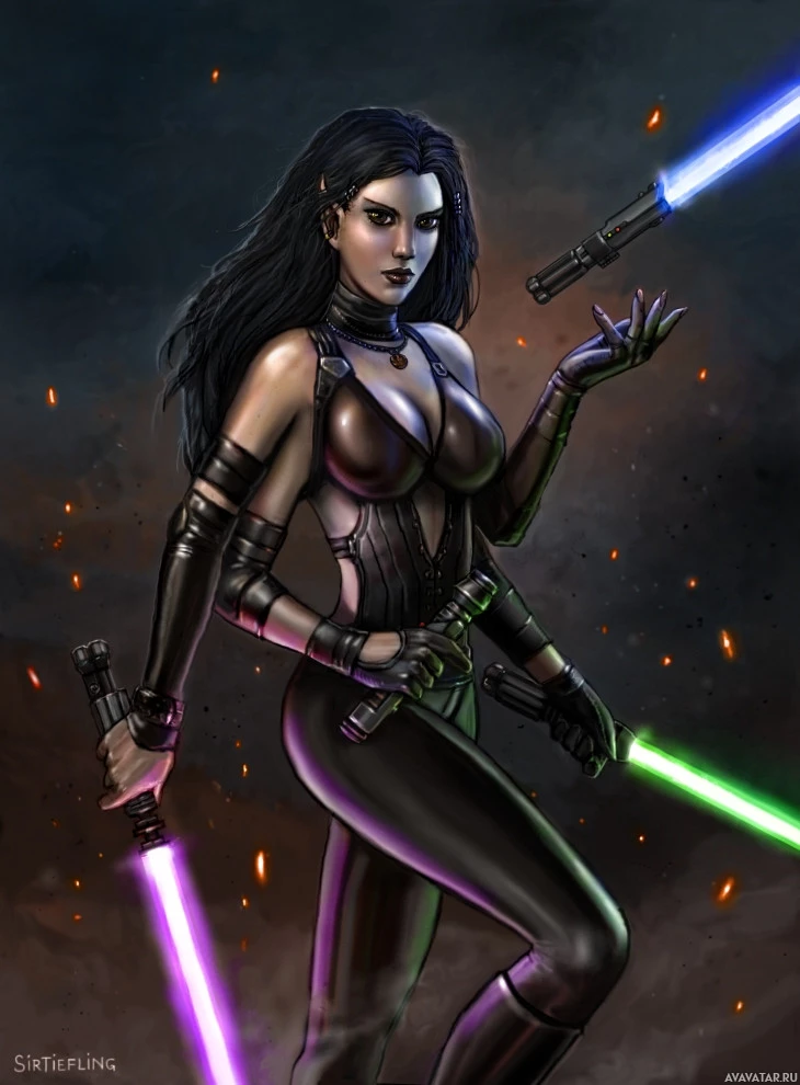 a female warrior or adventurer, inspired by the fantasy and action genres commonly associated with Star Wars. She is holding two lightsabers crossed in front of her, which is iconic to the franchise's characters. Her attire includes