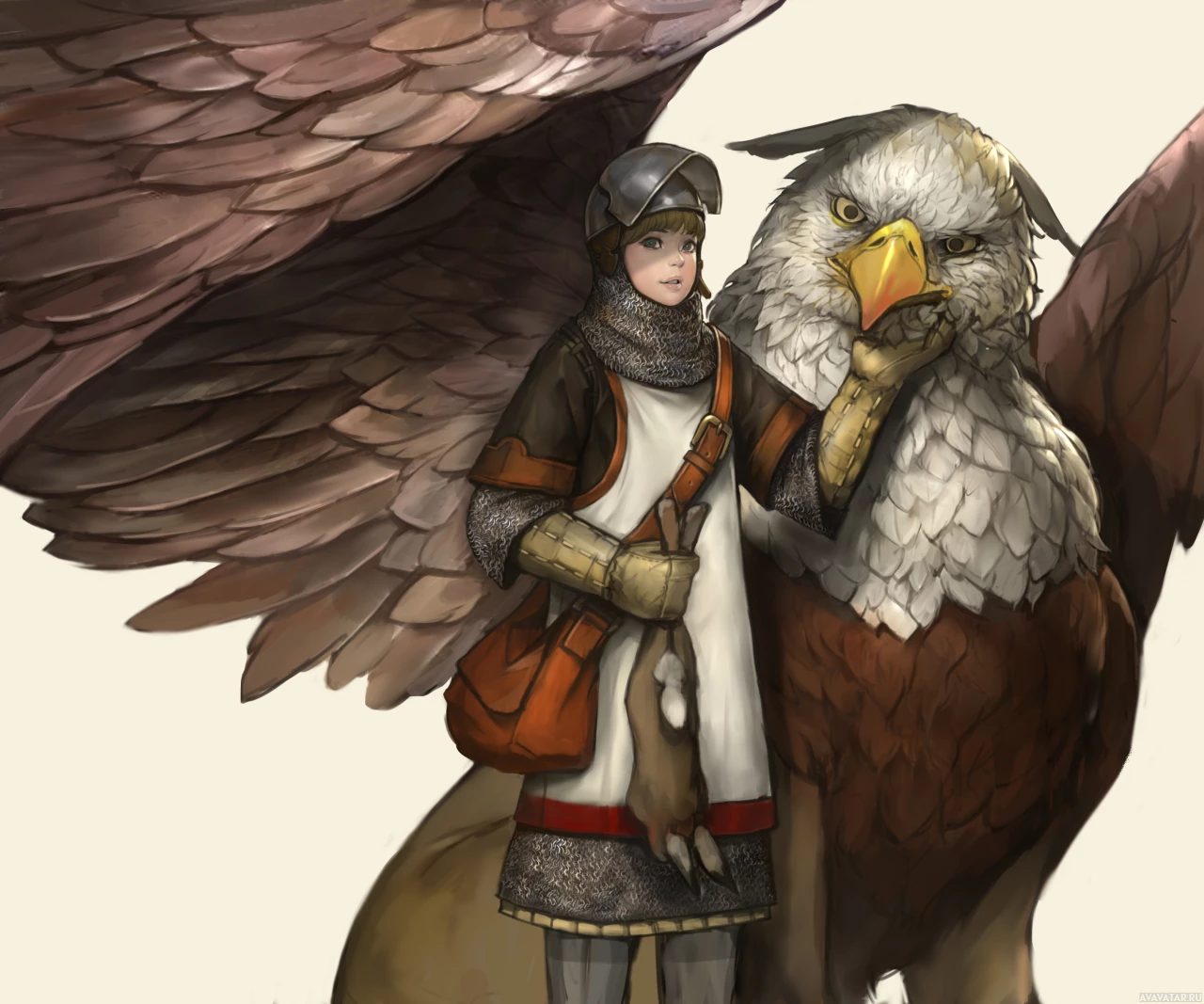 a shield design on the front side. Her attire includes chainmail and a crested helmet with her eyes visibly looking upwards and slightly to the right. She's holding a sword in one hand, which seems to be resting at her side. Behind her is a griffon,