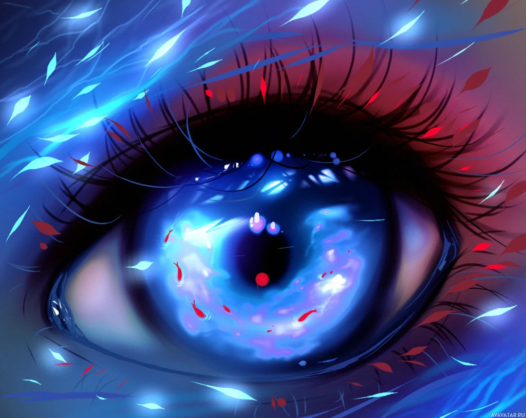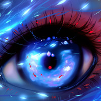 a blue iris with a reflection that looks like the sky or possibly another world within it. There are also small red details around the eye and some