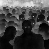 the eerie atmosphere of the image. There are no distinguishable facial features on the figures due to