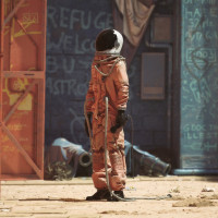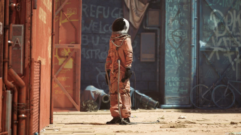 an astronaut suit standing on what appears to be the surface of the moon. The person is wearing a helmet with a visor and has their hands secured with straps that are connected to equipment not visible in this photo. The environment around them looks like a desolate