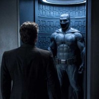 a Batman suit, complete with a cowl and cape. This character is standing inside what looks like a high-tech