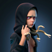 character design combines elements from Medusa's legendary status and adds a modern twist with contemporary clothing.
