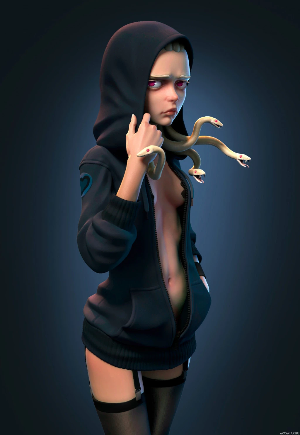 a hooded jacket, but instead of a typical human lower body, there are two serpent-like tails coiled around each other. This is a creative representation of Medusa, the Greek
