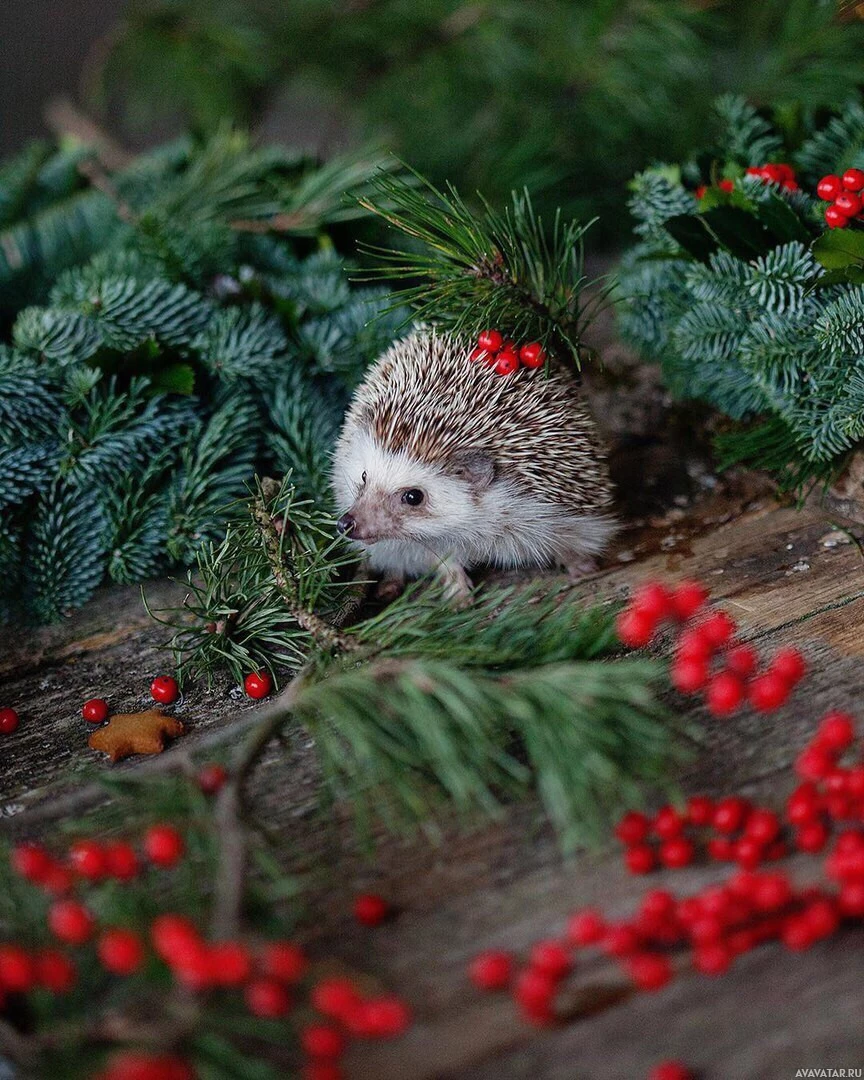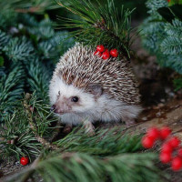 a piece of wood, with holly and berries scattered around it. The hedgehog is looking down at the ground, possibly investigating something or simply taking in its surroundings. The backdrop consists of greenery, likely evergreen branches or similar