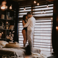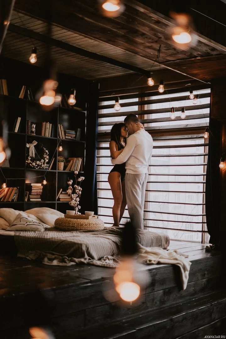 the cozy atmosphere of the scene. The lighting and ambiance hint at a romantic or affectionate situation.