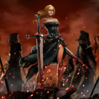The image depicts a fantasy-themed illustration of a female character. She has blonde hair and is dressed in dark armor with accents that resemble bones, suggesting a gothic or warrior theme. She holds a sword in her right hand and stands on what appears to be a battlefield with flames around her, indicating conflict or danger. The character's pose and attire imply she might be a warrior or adventurer in a fantasy setting.