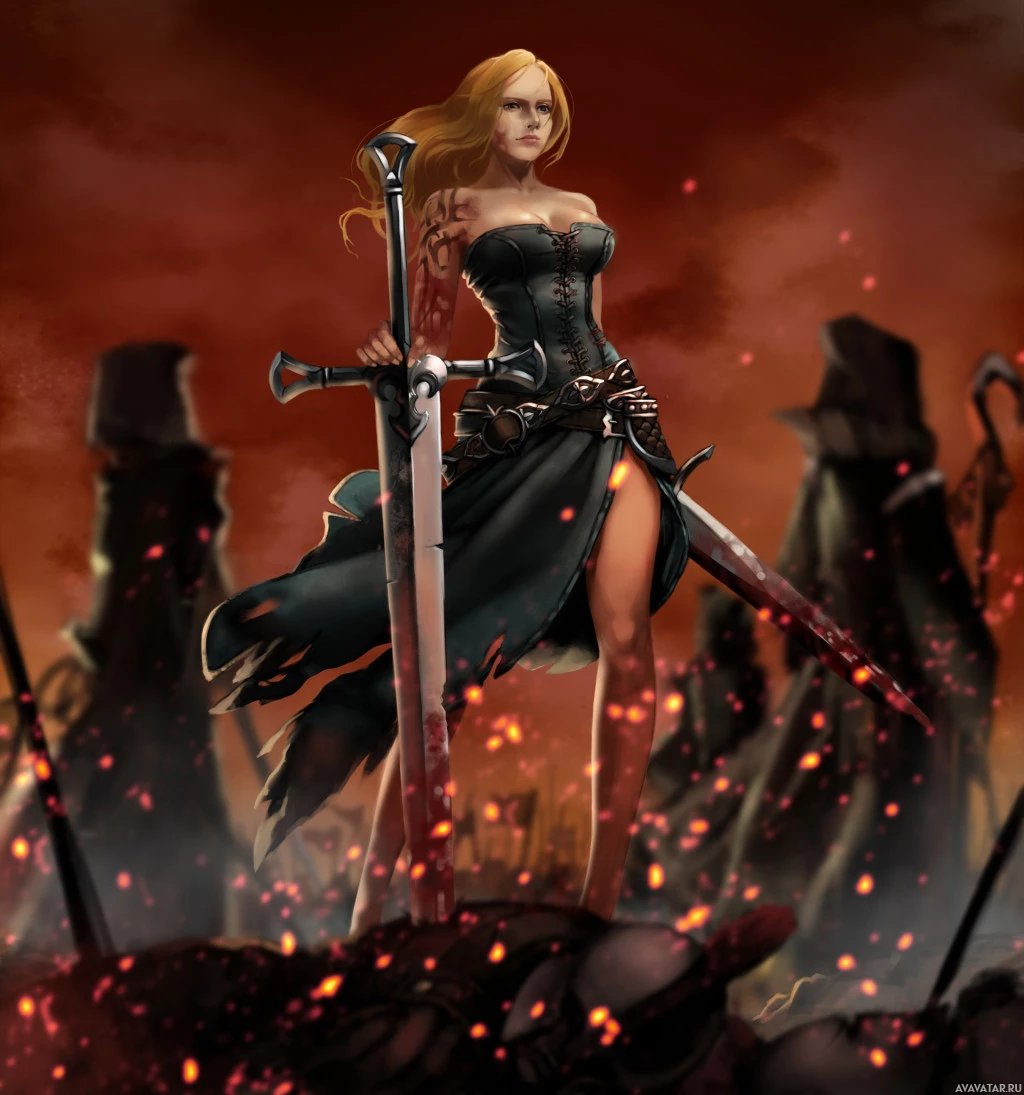 На картинке изображена фэнтезийная тематическая иллюстрация женского персонажа. У нее светлые волосы и она одета в темные доспехи с акцентами, которые напоминают кости, предлагая готику или тему воина. Она держит меч в правой руке и стоит на поле боя с пламенем вокруг нее, что указывает на конфликт или опасность. Поза и одежда персонажа предполагают, что она может быть воином или искателем приключений в фантастической обстановке.