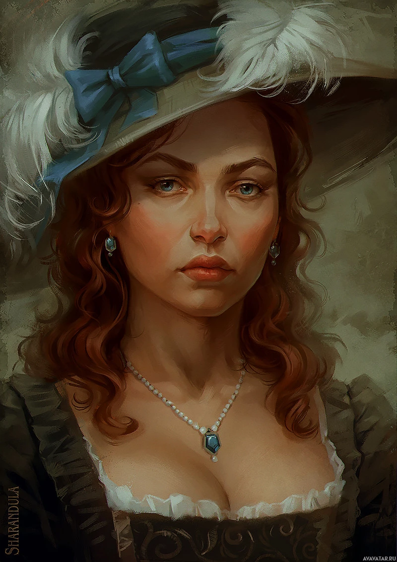 an elaborate hat adorned with feathers and possibly other embellishments, suggesting a fashionable or formal occasion. The background is neutral-toned, putting the focus on her face. The painting style appears to be realistic, capturing fine details in the subject's features and attire.