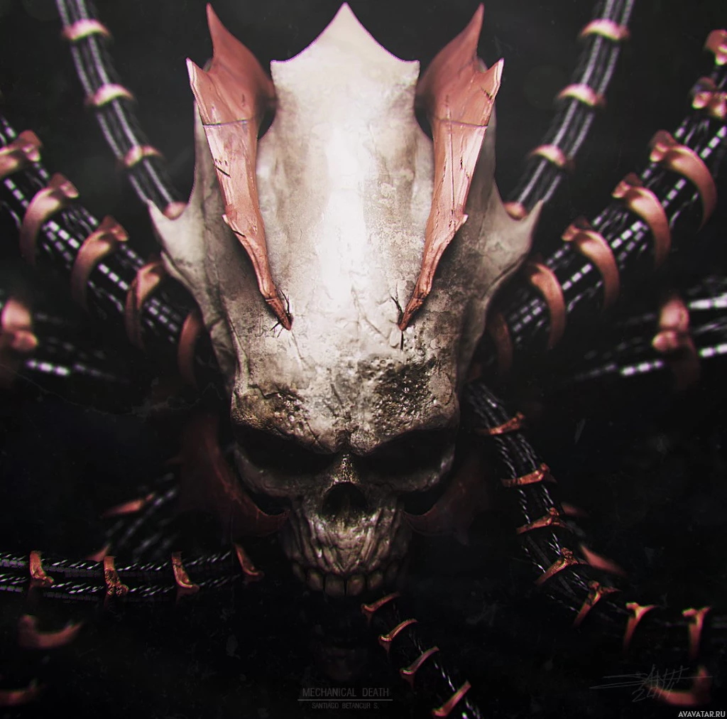 red accents, including what appears to be robotic or mechanical components. This could be an artistic representation of a futuristic or cybernetic theme, where the skull symbolizes death and resurrection through technology.