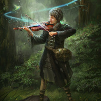 The image depicts a fantasy-themed illustration of a character playing the violin. The person is dressed in
