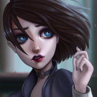 a dark outfit, possibly inspired by the Bioshock series, which is known for its steampunk and art deco themes. The character's expression is contemplative or sad, and she seems to be looking off to the side with her hand placed thoughtfully on her chin. The setting looks like a room from an older, possibly industrial era, suggesting a narrative that might involve historical or futuristic elements common in