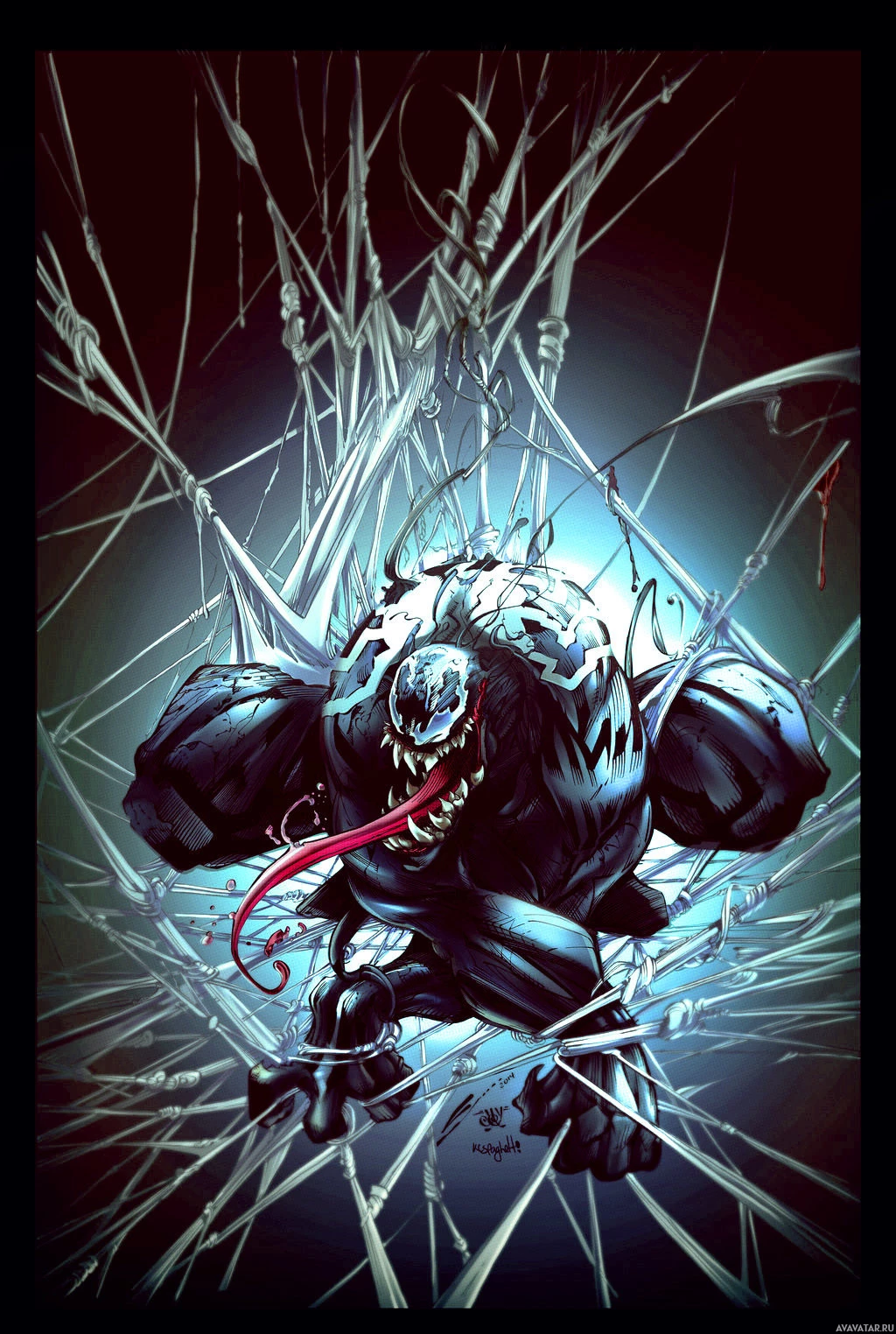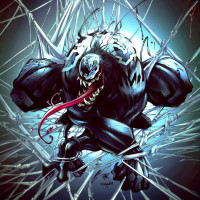black suit with white spider-like markings and the symbiote's tongue extended out, giving him an intimidating appearance. Behind him are numerous cracks and shards that represent the power he possesses or possibly