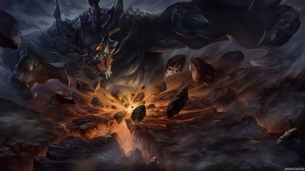 a powerful demon or monster with horns and large claws. This creature is set against a backdrop of