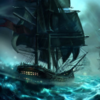 a dramatic scene with several ships set against a tumultuous sea backdrop. There are two large ships in the foreground, one of which is partially submerged as if it has run aground or been involved in a shipwreck. Another smaller boat can be seen near the top left corner of the image, seemingly caught in