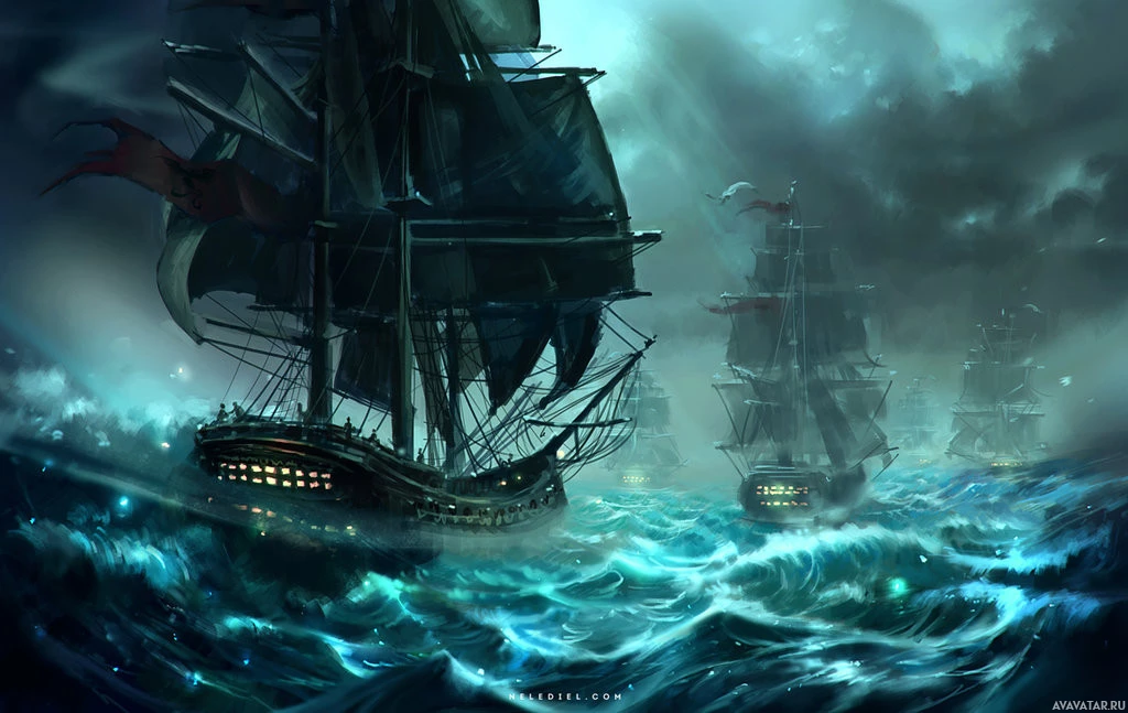the water in the background. The overall atmosphere is one of danger and adventure at sea.