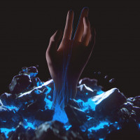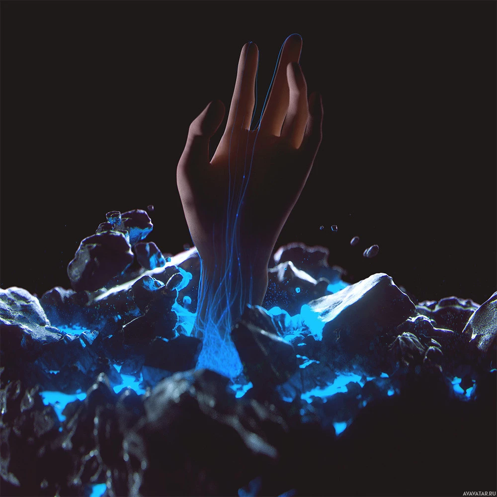 dark space, and at the bottom, there are blocks or rocks that are glowing blue with lines or veins running through them. This composition creates