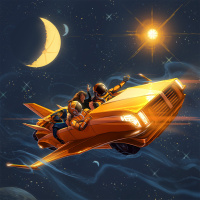 outer space. In the foreground, there is a bright yellow, futuristic-looking car with