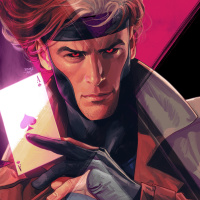 a blue top, and he is holding a playing card, specifically the ace of spades, which is held up by his right hand. His left hand is tucked into a black holster, suggesting readiness for action. The background has a neon