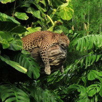 the camouflage pattern of its fur. It appears to be resting or possibly stalking prey given its position and alert posture. The background suggests a dense
