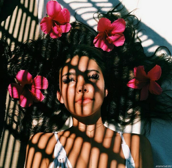 an impression of relaxation or contemplation. Her face appears calm and serene. Surrounding her head are