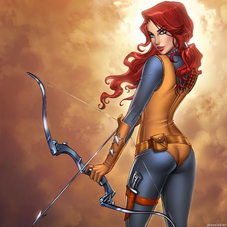 red hair and is wearing a tight-fitting, blue and black costume that resembles a superheroine's outfit. She also has a quiver with arrows on her back and is holding a bow in her right hand, which suggests she may be an archer or a character with