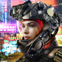 an urban environment with signs written in an East Asian language, possibly Chinese, indicating a futuristic city scene. The overall theme of the image is