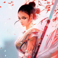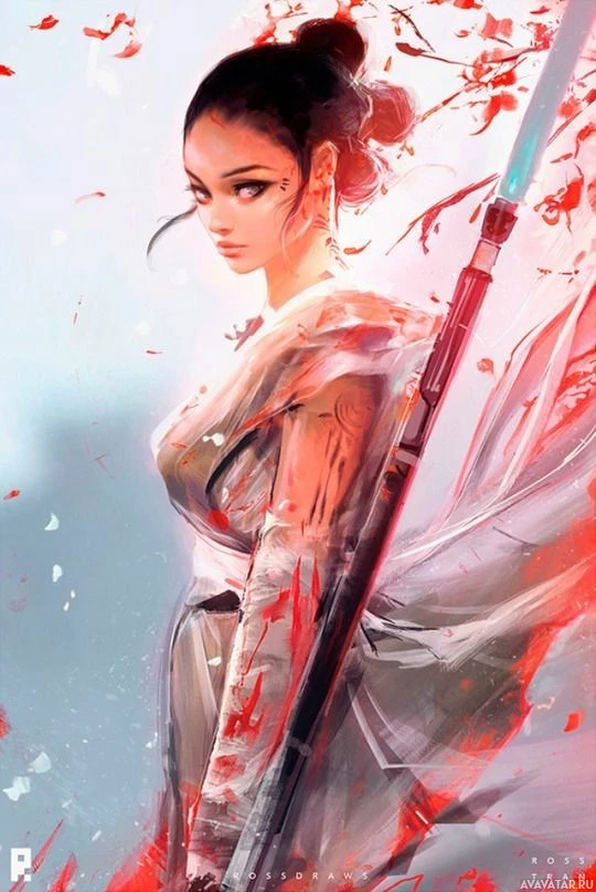 a female character who appears to be Rey from the "Star Wars" franchise. She is holding a lightsaber in her right hand and has a determined expression on her face, looking off into the distance. Her attire and accessories are consistent with her character's outfit and style as seen in the movies. The background features what seems to be a blurred representation of snow or ice particles, which could suggest a cold environment like Hoth from "