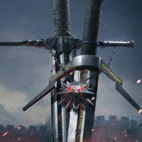 The image shows a character from the video game "The Witcher 3: Wild Hunt" holding two swords. The character is standing in front of what appears to be a castle or fortress with rain and lightning in the background, suggesting an intense battle scene. The swords have intricate designs on them, indicating that they are likely magical or enchanted within the context of the game. This is clearly a screenshot from a video game.