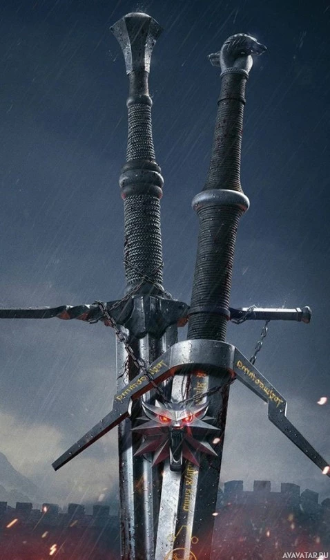 На картинке изображен персонаж из видеоигры «Ведьмак 3: Дикая Охота», держащий два меча. Персонаж стоит перед тем, что кажется замком или крепостью с дождем и молнией на заднем плане, предполагая интенсивную сцену битвы. Мечи имеют замысловатые конструкции, указывающие на то, что они, вероятно, волшебные или заколдованные в контексте игры. Это явно скриншот из видеоигры.